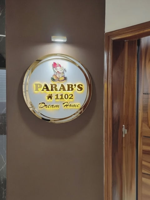 - This 15-inch round glass nameplate features a pristine white backpainted glass base crowned with precision-cut golden acrylic letters that catch the eye.